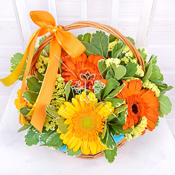 Гербера желтая и оранжевая- 7 шт.,питтоспорум,  статица желтая, оазис, корзинка.